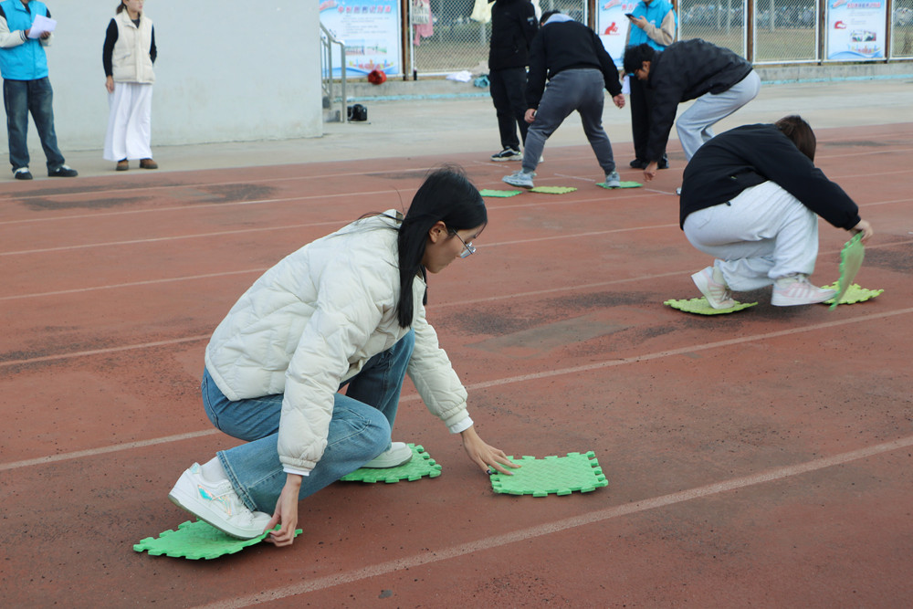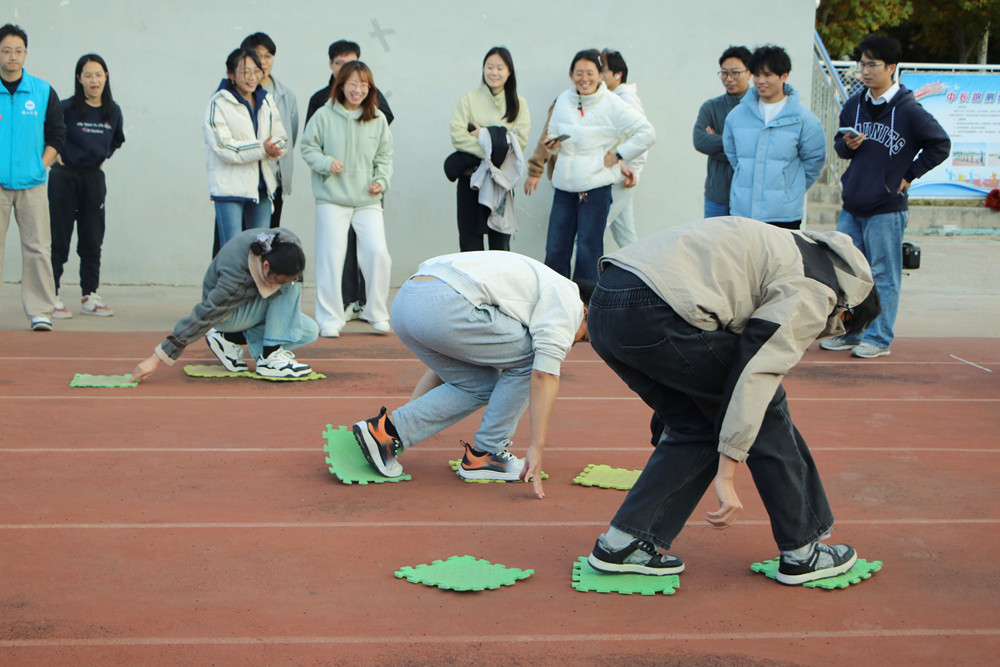 “摸石过河”则是对技巧和耐心的考验,队员们需要灵活运用三块“石头”交替前行,时而因稳健疾行赢得喝彩,时而又因不慎“落水”引发善意的笑声,充分展现了游戏的趣味性,并彰显了电院青年学子攻坚克难的毅力。