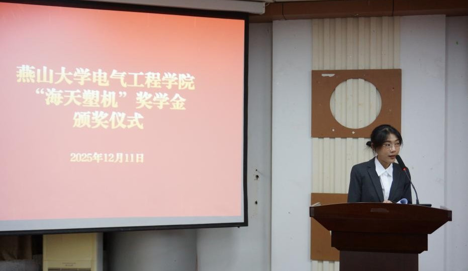 寒冬时节,暖意融融。2025年12月11日,电气工程学院2025年“海天塑机”奖学金颁奖仪式在电气馆A楼101会议室温情启幕。海天集团招聘经理王嘉毅、校招经理应鑫超,燕山大学校友办副主任兼基金管理办公室主任纪红月,电气工程学院党委副书记朱坤及学院全体辅导员出席仪式,与18名获奖师生共同见证荣誉时刻。仪式由辅导员徐小焱老师主持。