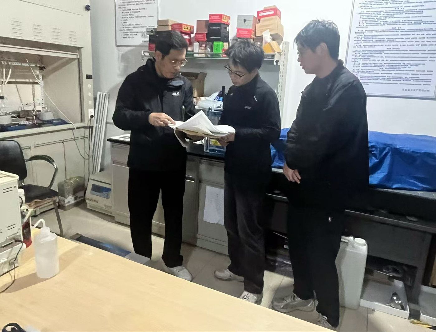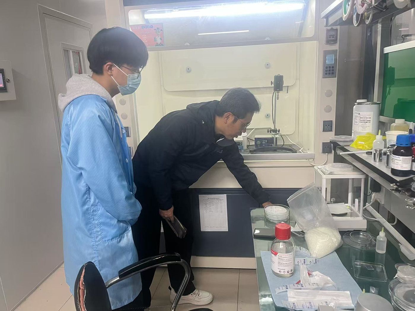 此次安全检查主要围绕仪器设备运行状态、用电安全、消防安全、危化品存储与使用等关键环节进行细致排查。针对现场发现的危化品存放不当、危化品台账不完整等潜在隐患,明确整改责任人及完成时限,并对实验操作人员进行现场安全提醒,强调规范操作流程,提升安全防范意识。