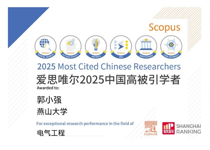 近日,爱思唯尔(Elsevier)正式发布2025“中国高被引学者” (Highly Cited Chinese Researchers) 榜单,全校共入选6人,我院控制科学与工程学科华长春教授和电气工程学科郭小强教授2位教师入选中国高被引学者,入选数量居全校前列。